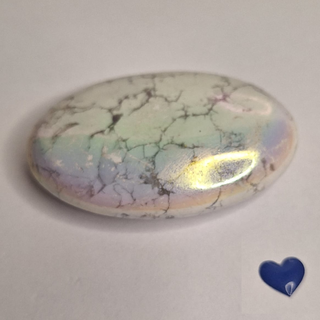 Aura Howlite begins as the naturally calming white Howlite, known for quieting an overactive mind and easing emotional tension. It is then bonded with a shimmering aura coating that adds a layer of rainbow light energy, amplifying peace, joy, and higher connection. In palm stone form, it is perfectly shaped to rest in the hand, radiating comfort, serenity, and gentle heart-opening energy.